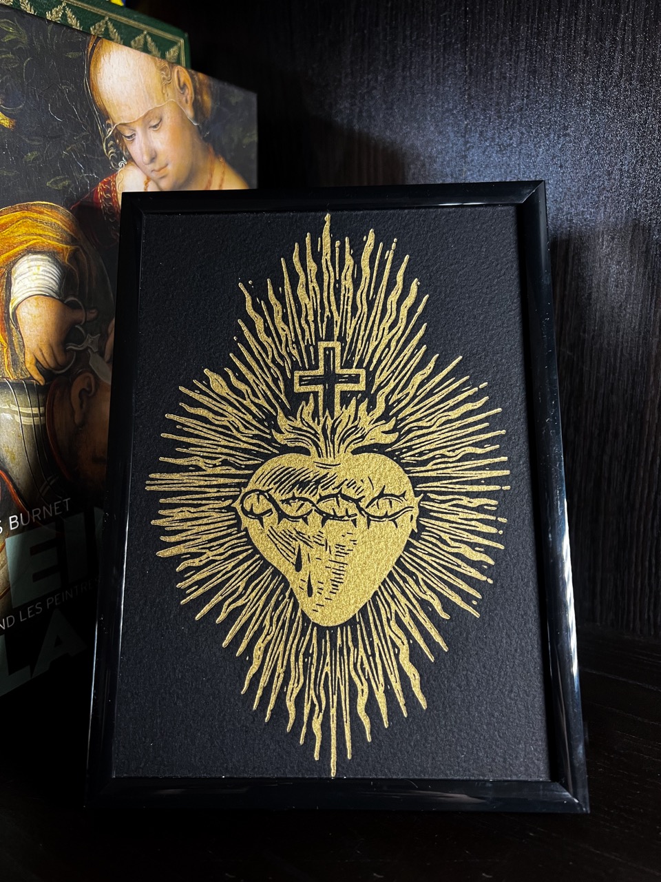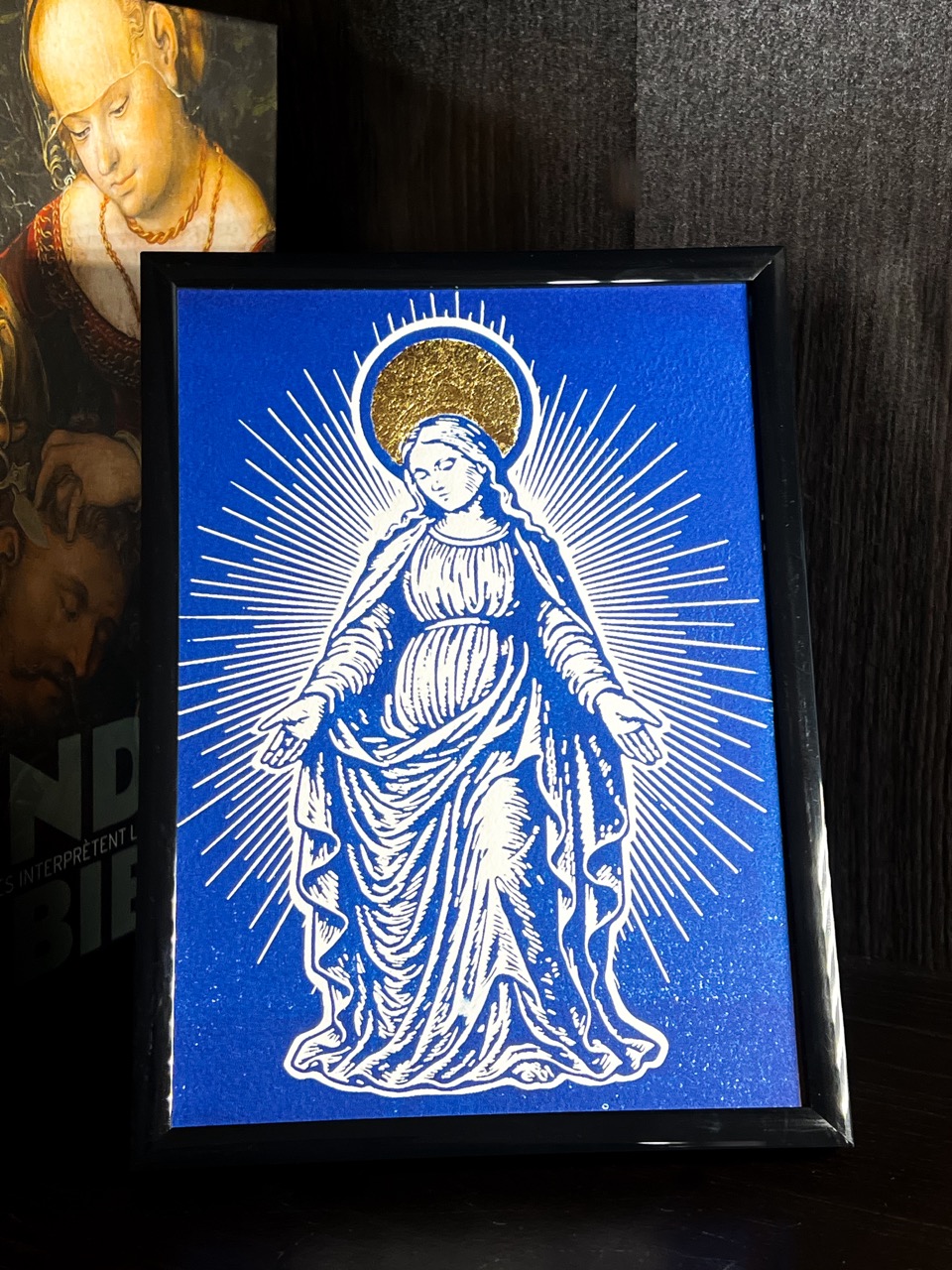 On y voit l’Archange terrassant le mal, épée levée, symbole de protection et de victoire de Dieu. Le halo doré autour de sa tête rappelle sa mission divine et sa présence lumineuse. Le noir profond du trait met en valeur chaque détail du combat spirituel.